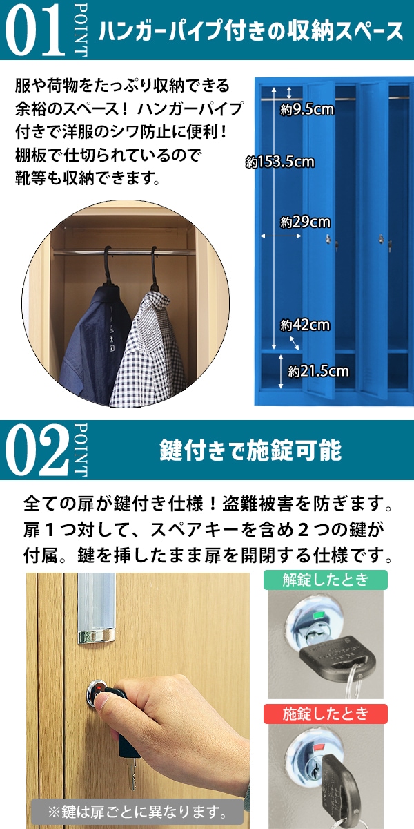 ■3人用のスチールロッカーです。 ■靴や手荷物、洋服等の収納に大変便利です。 ■鍵付きですべての扉を施錠可能! ■鍵は、6個(内スペアキー3個)付属しています。 ■物置、ロッカー、棚等、様々な用途でご使用いただけます。 ■粉体塗装を施し、キズや剥がれを防ぎ、錆びにくい仕様となっています。 ■材質・・・スチール[本体(スチール厚み・・約0.6mm)]、ステンレス[鍵穴]、亜鉛メッキ鋼[鍵]、プラスチック[鍵] ■重量・・・約41kg ■耐荷重・・・約20kg(ハンガーパイプ)、約30kg(ロッカー内棚板)、約30kg(ロッカー内底面) ■塗装・・・粉体塗装 ★組み立てについて★ 組み立て式です。(大人2名で組み立てられます。) こちらの商品は、ネジやビスなどを使用せず組み立てる事が出来、比較的簡単に組み立てられます。 組立てにくい場合には、マイナスドライバーをご用意下さい。 ●新品商品ではありますが、輸入商品の為、多少の擦り傷などがある場合がございますので、ご納得の上ご購入下さいませ。 ●ご購入後、お客様ご都合によるご返品、ご返金等は一切お受け致しておりません。 ●本商品を使用した際に発生したトラブル、事故につきまして、当社は一切の責任を負いません。ご使用に関しましては、全て自己責任にてお願い致します。 |