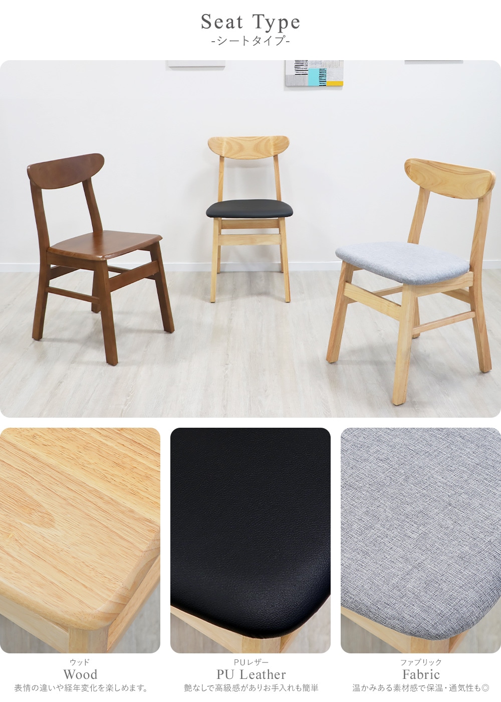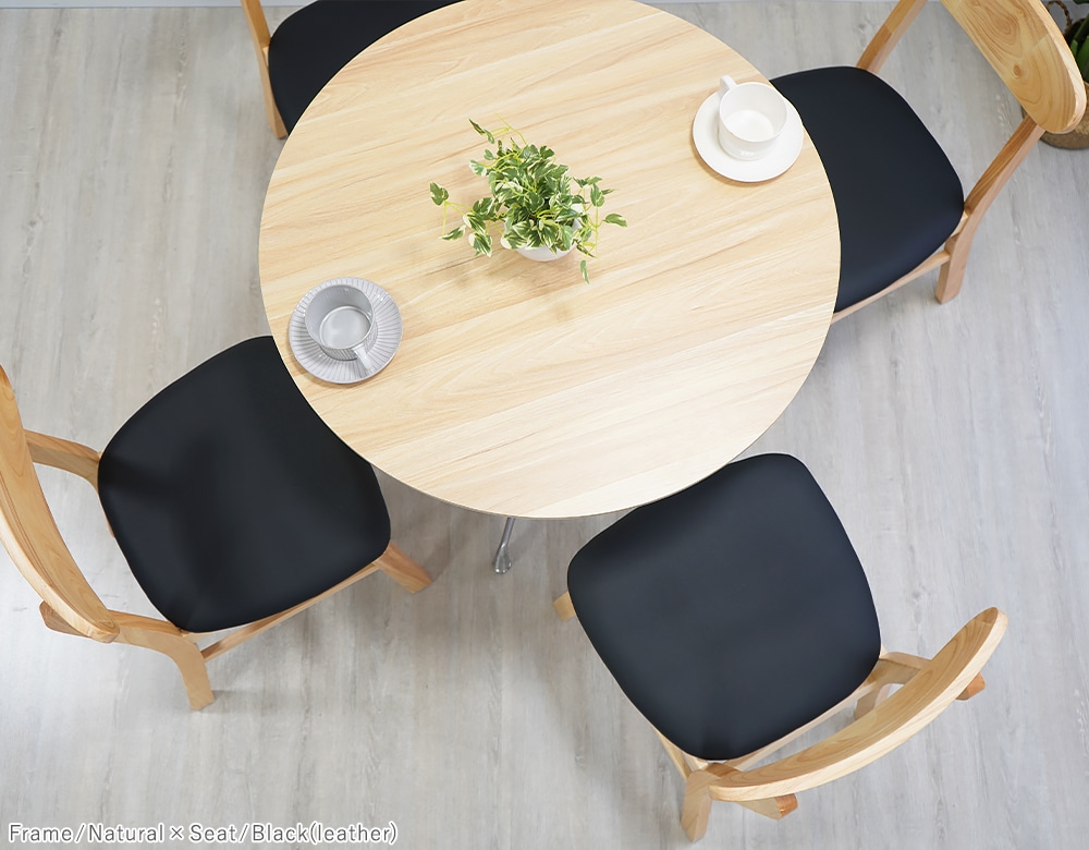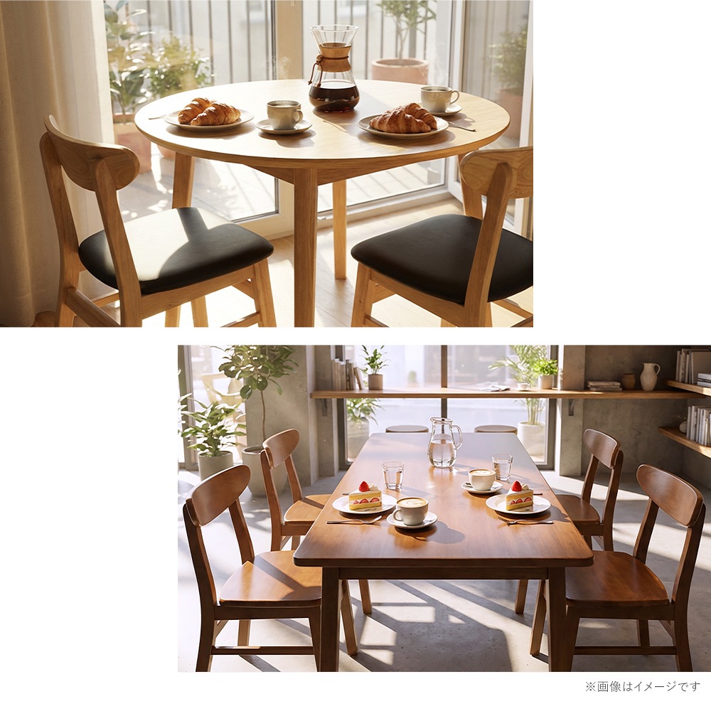 | 材質 | 〈共通〉ラバーウッド[無垢材](本体)、PVC[ポリ塩化ビニル](チェア脚裏) 〈張り地〉PUレザー/PU(ポリウレタン)、ファブリック/リネン |