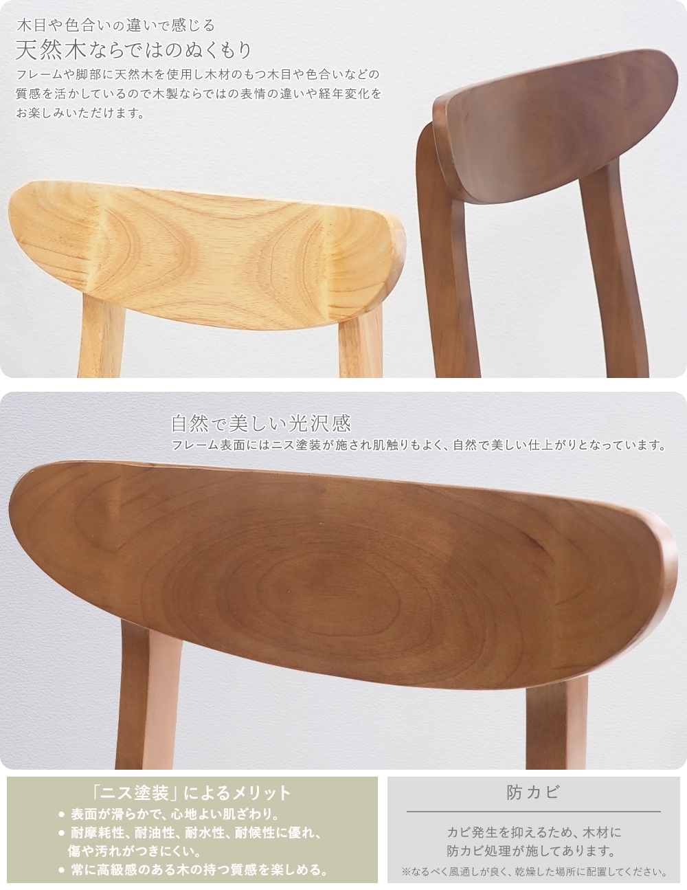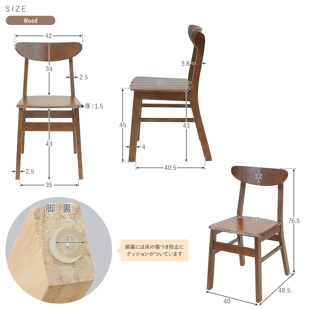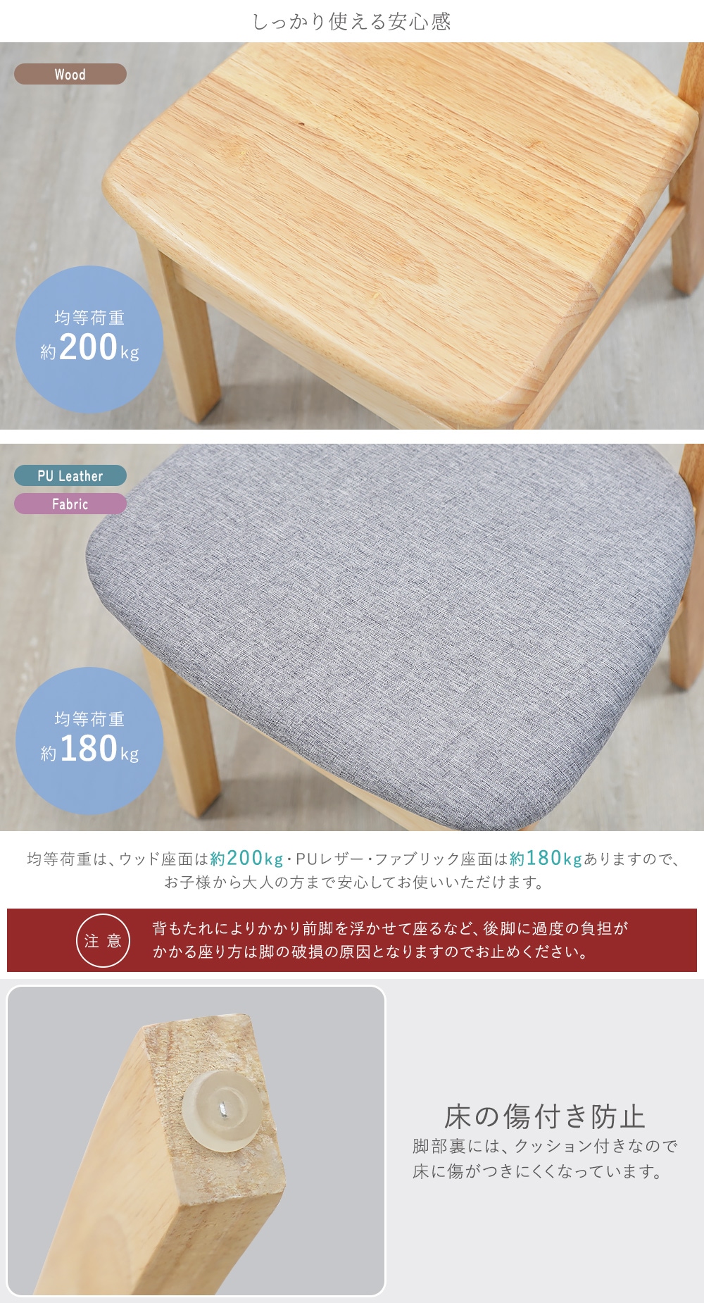 ●ウッド/PUレザー/ファブリックの3種のシートとカラー、2色のフレームカラーの中からお選びいただけます。 ●背もたれは、緩やかな角度と曲線を描いており、背中にやさしくフィットし、体をしっかり支えてくれます。 ●天然木のラバーウッドを使用しているので、異なる木目や、経年変化による色の違いなど、木製ならではの味わいをお楽しみいただけます。 ●ニス塗装が施されているので、美しい光沢で肌触りも心地よく滑らかです。 ●座面には緩やかな傾斜がついているので深く腰掛けられるので疲れにくい仕様になっています ●均等荷重はウッド座面は約200kg、PUレザー・ファブリック座面は約180kgとしっかりしているので、お子様から大人の方まで安心して使用できます。 ●脚裏には、床の傷つき防止のクッションがついていて安心です。 ●完成品なので、届いてすぐに使用できます。 ■重量: シート:ウッド/約4.7kg、PUレザー・ファブリック/約4.4kg ■耐荷重: シート:ウッド/約200kg、PUレザー・ファブリック/約180kg ■材質: 〈共通〉ラバーウッド[無垢材](本体)、PVC[ポリ塩化ビニル](チェア脚裏) 〈張り地〉PUレザー/PU(ポリウレタン)、ファブリック/リネン ●新品商品ではありますが、輸入商品の為、多少の擦り傷などがある場合がございますので、ご納得の上ご購入下さいませ。 ●ご購入後、お客様ご都合によるご返品、ご返金等は一切お受け致しておりません。 ●本商品を使用した際に発生したトラブル、事故につきまして、当社は一切の責任を負いません。ご使用に関しましては、全て自己責任にてお願い致します。 |