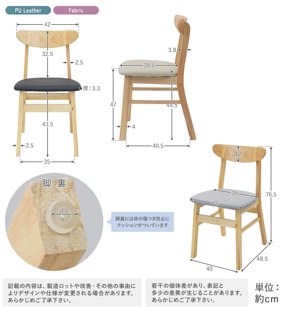 | 重量 | シートタイプ: ウッド/約4.7kg(1脚) PUレザー・ファブリック/約4.4kg(1脚) |