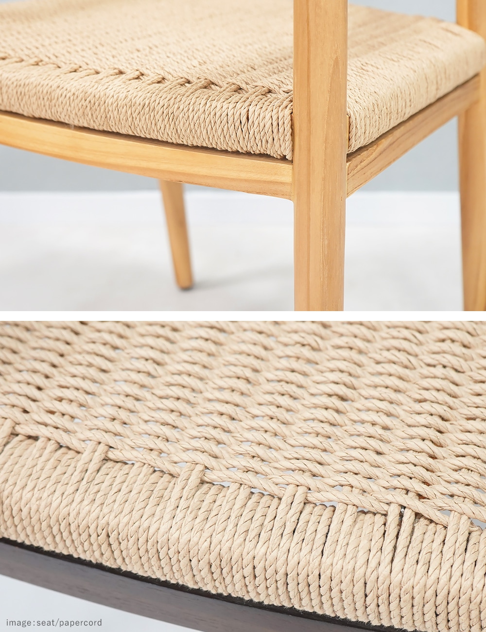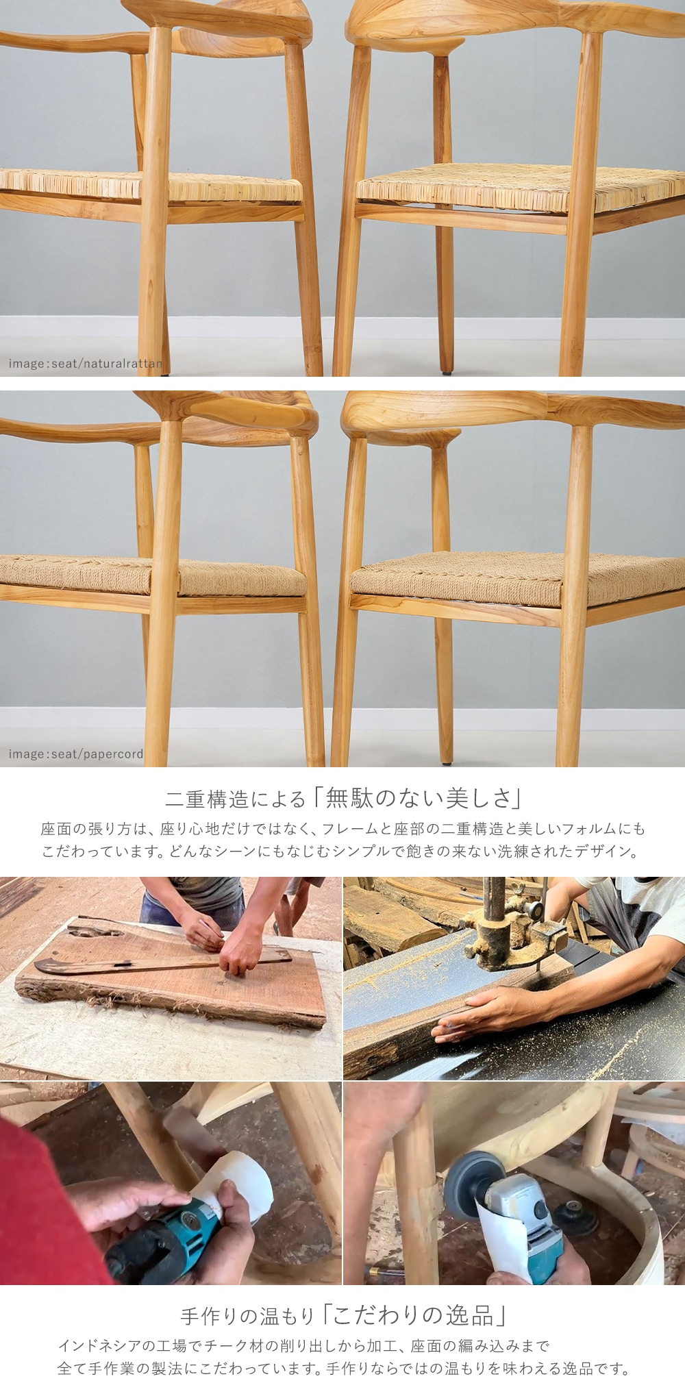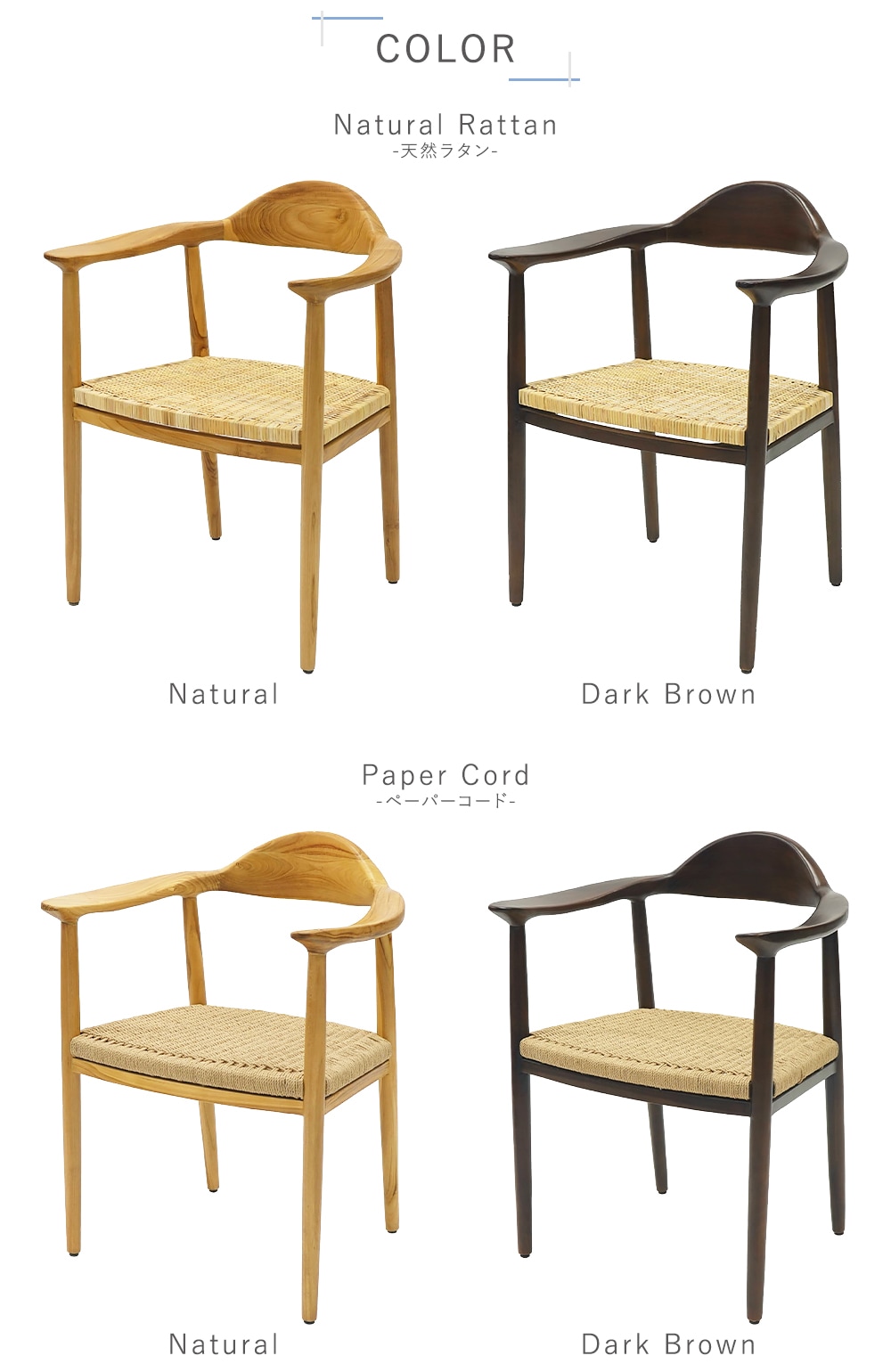 〈共通〉チークウッド[無垢材](本体)、PP[ポリプロピレン](脚裏) 〈張り地〉天然ラタン、ペーパーコード |
