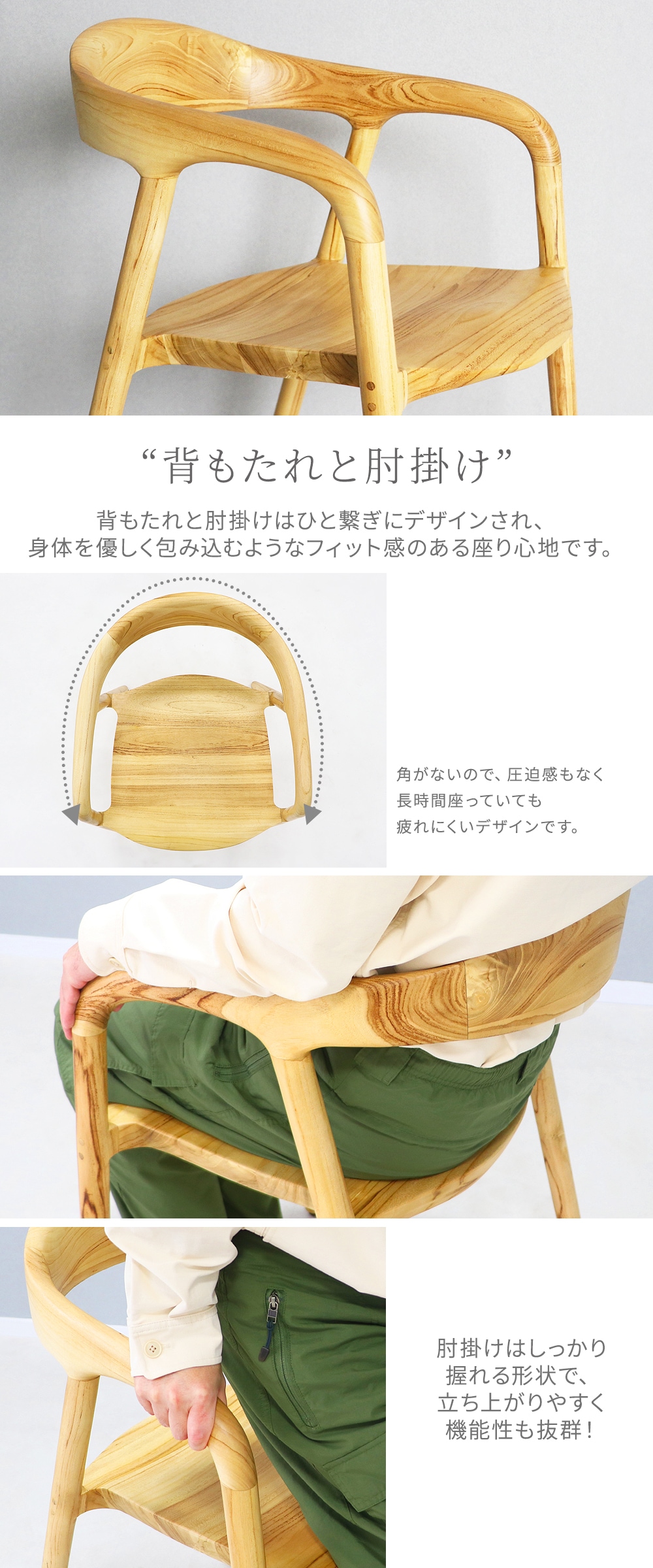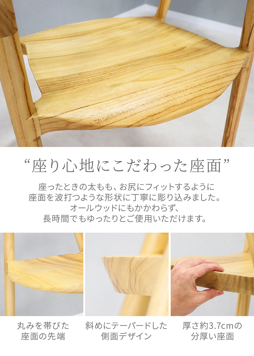 ●まるで一本の木から削り出したような「一体感」のある形のチェアです。 ●インドネシア産のチーク無垢材のオールウッドチェアで、使い込むほど増していく味わいをお楽しみいただけます。 ●背もたれと肘掛けはひと繋ぎにデザインされ、身体を優しく包み込むようなフィット感のある座り心地です。 ●座ったときに太もも、お尻にフィットするように座面を丁寧に彫り込みました。 ●座面が傾斜しているため、より深く座れて疲れにくい設計になっています。 ●脚は外側に向かってハの字に広がっていて安定感があります。 ●チーク材の削り出しから加工まで全て手作業で行われ、手作りならではの温もりを味わえる逸品です。 ●座面の厚さは約3.7cmと、しっかりした仕様になっています。 ●銘木『チークウッド』のならではの深みや心地よさを感じられます。 ●なめらかで美しい、自然な光沢感があります。 ●完成品なので、届いてすぐに使用できます。 ■重量:約7.2kg ■耐荷重:約150kg ■材質:〈本体〉チークウッド[無垢材]/〈脚裏〉プラスチック ●新品商品ではありますが、輸入商品の為、多少の擦り傷などがある場合がございますので、ご納得の上ご購入下さいませ。 ●ご購入後、お客様ご都合によるご返品、ご返金等は一切お受け致しておりません。 ●本商品を使用した際に発生したトラブル、事故につきまして、当社は一切の責任を負いません。ご使用に関しましては、全て自己責任にてお願い致します。 |