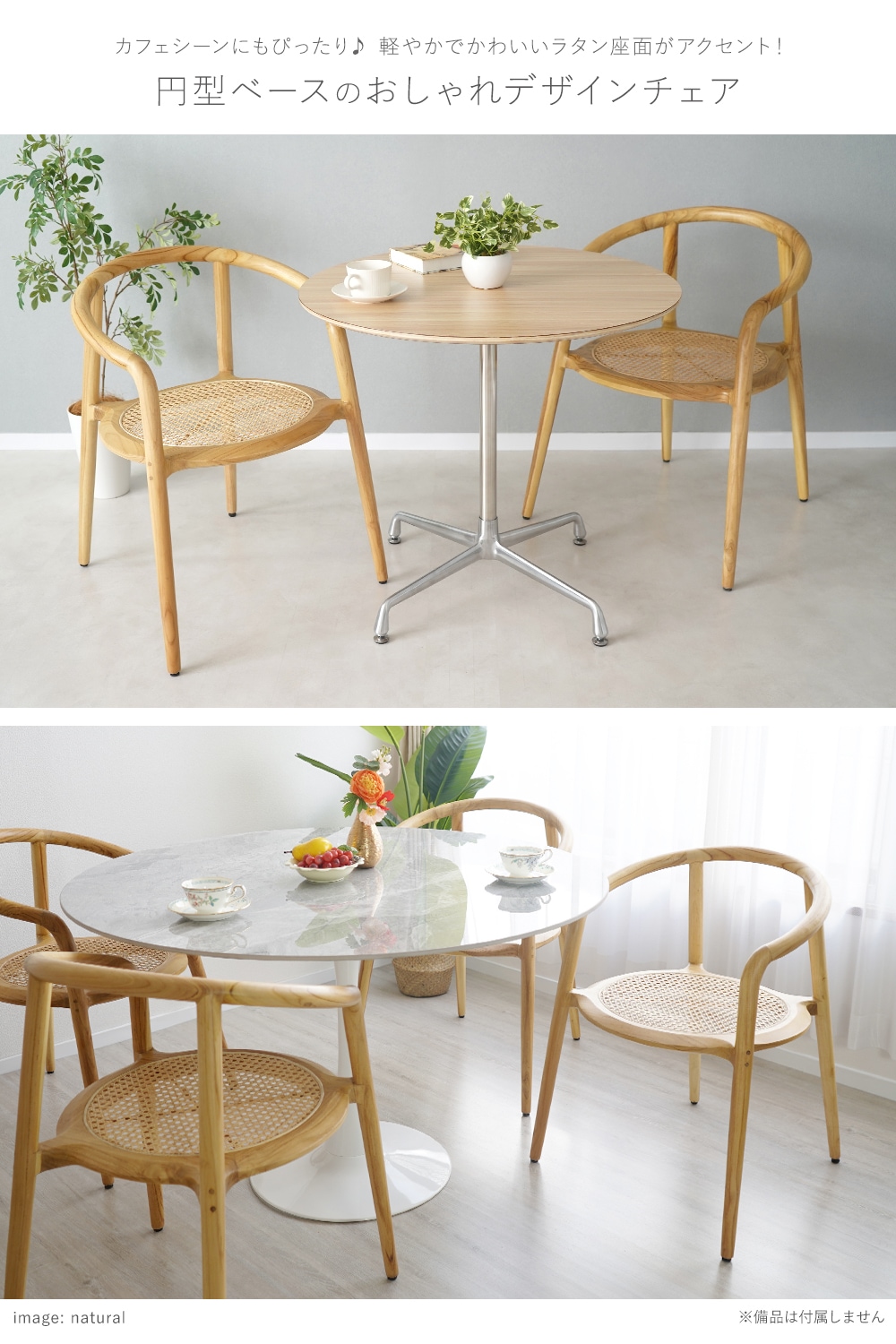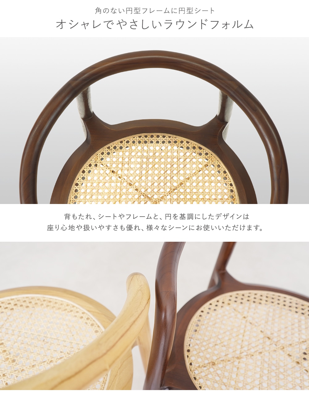 軽やかでかわいいラタン座面がアクセント! 円型ベースのおしゃれデザインチェア