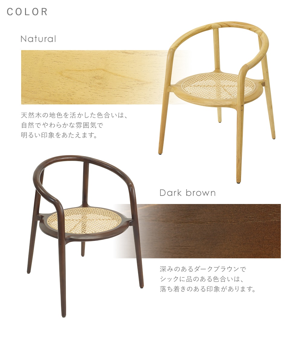 | 材質 | 〈本体〉チークウッド[無垢材]〈脚裏〉PP[ポリプロピレン]〈張り地〉天然ラタン |