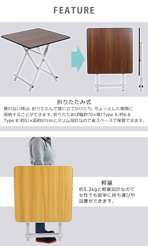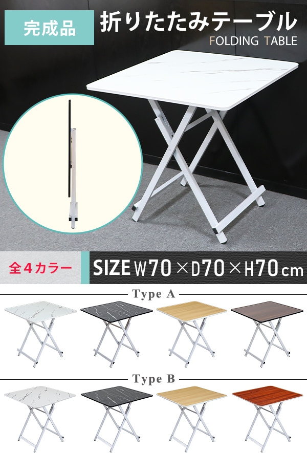折りたたみテーブル ダイニングテーブル 約幅70×奥行70×高さ70cm 耐荷重約70kg 完成品 組み立て不要 合板 軽量 コンパクト 折りたたみ式 折りたたみデスク パソコンデスク 木製天板 テーブル 食卓 勉強机 作業机 ワークテーブル ウォールデスク