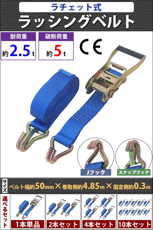 ラッシングベルト ラチェット式 1本/2本/4本/10本セット 全長約5m 幅約50mm 耐荷重約2.5t 破断荷重約5t 約2500kg 約5000kg Jフック スナップフック タイダウンベルト 荷締め バンド ベルト フック 積載 車載 固定 引越し 運搬 荷物 トラック J型