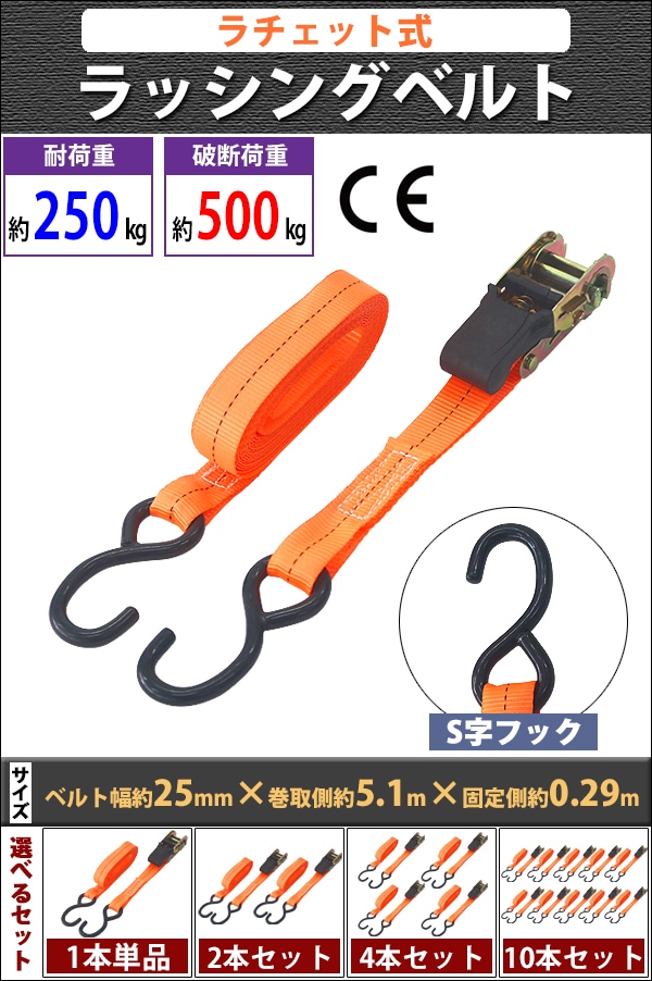 ラッシングベルト ラチェット式 1本/2本/4本/10本セット 全長約5m 幅約25mm 耐荷重約250kg 破断荷重約500kg 約0.25t 約0.5t S字フック Sフック タイダウンベルト 荷締め バンド ベルト フック 積載 車載 固定 引越し 運搬 荷物 トラック バイク S型